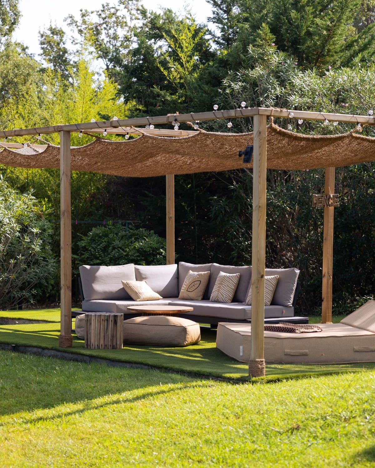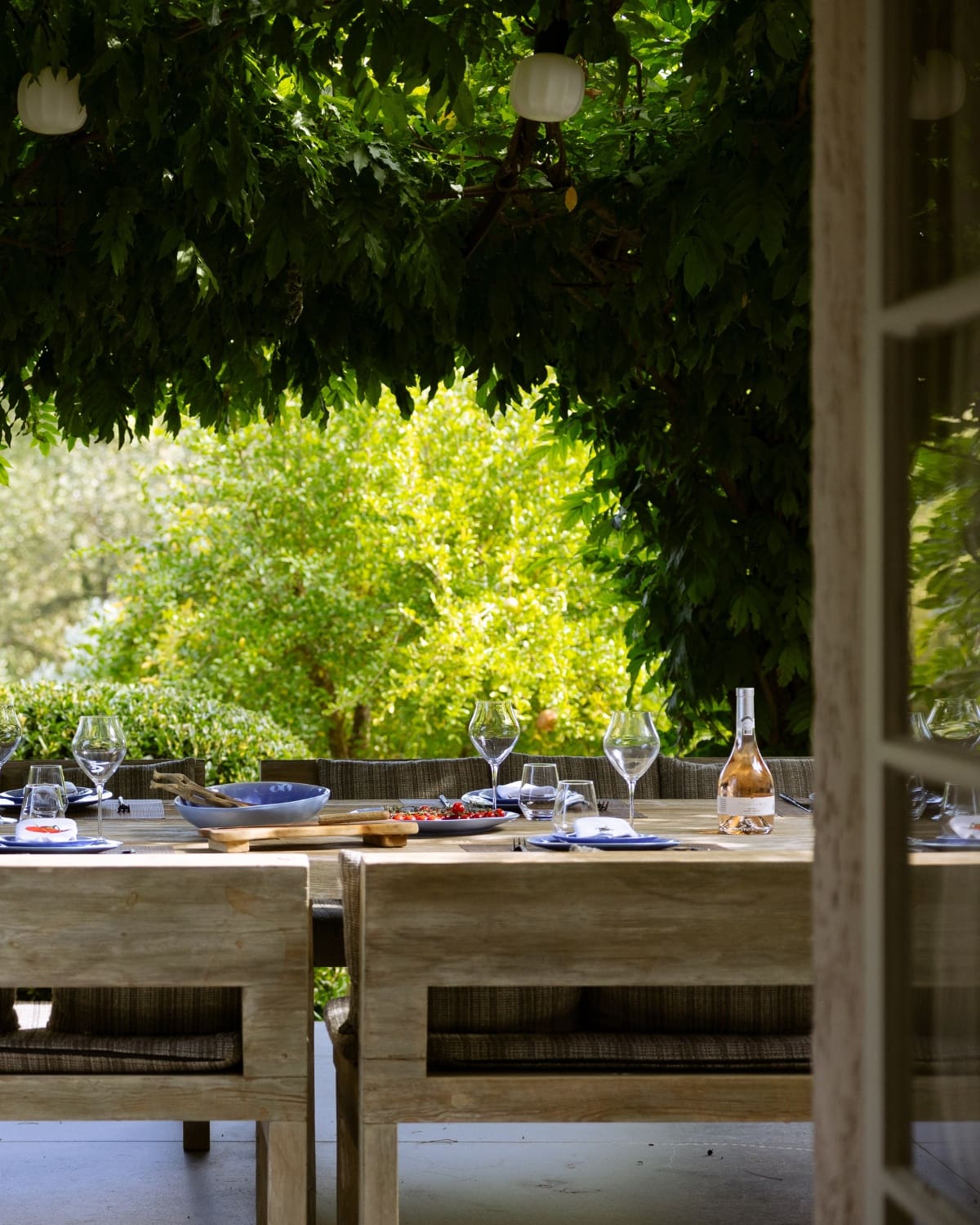 Outdoors, a shaded terrace under a pergola and a plane tree welcomes summer meals in an intimate and convivial atmosphere. The large wooden table invites long lunches and dinners facing the surrounding nature.
