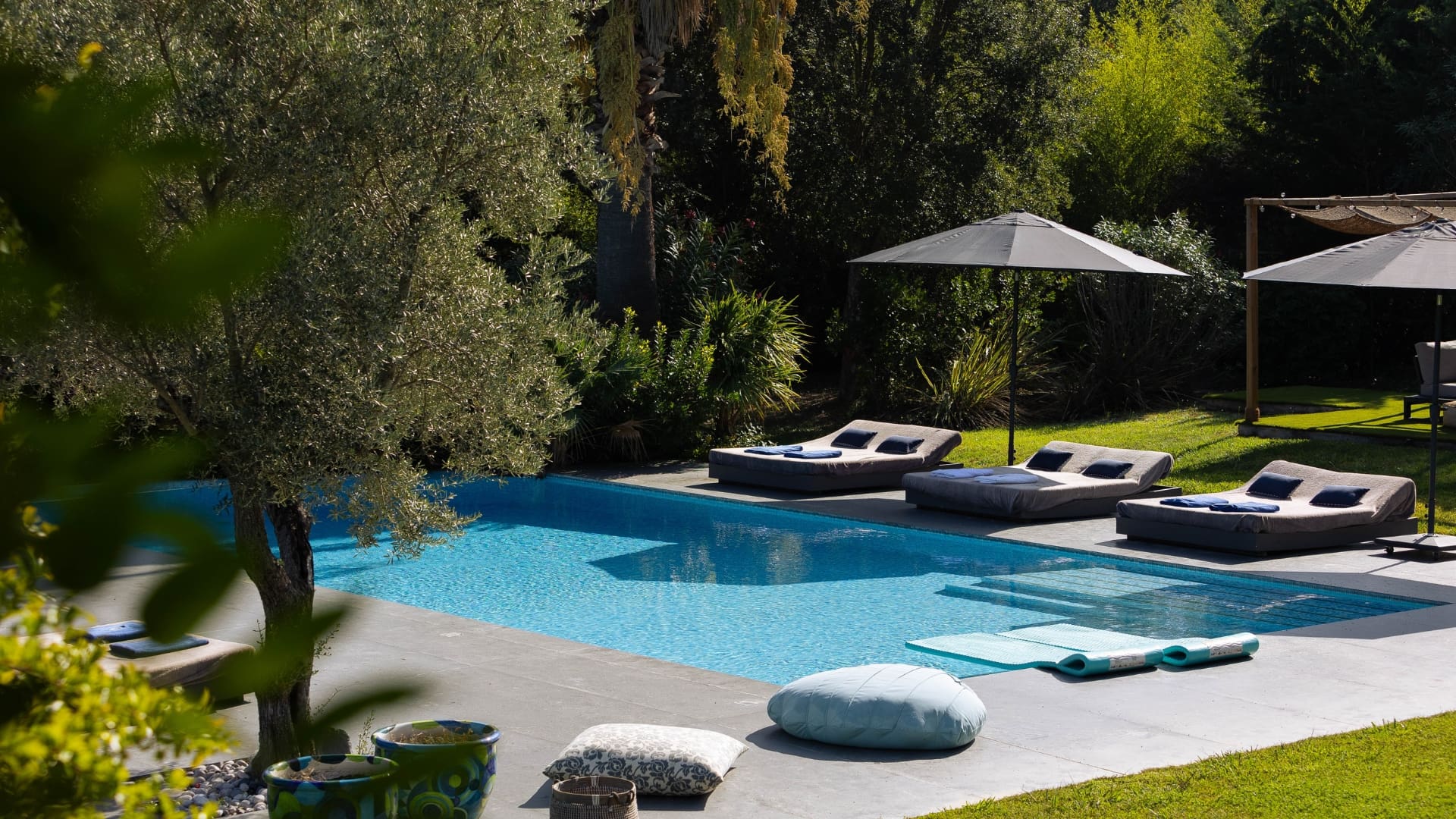 The 5,500 sqm landscaped garden, perfectly maintained, surrounds the house and creates a true sense of space and freedom. At the heart of this setting, the heated swimming pool and its generous relaxation areas invite you to slow down and fully enjoy each moment.