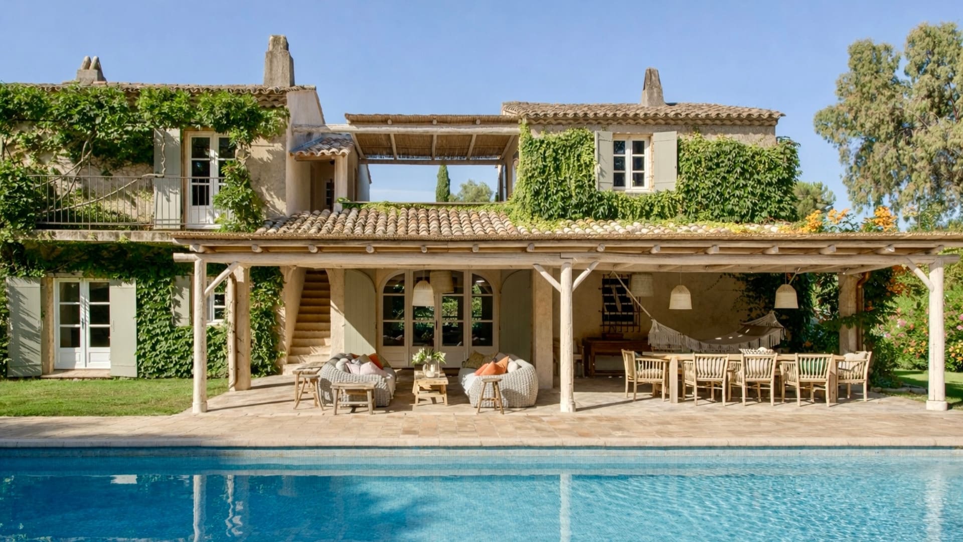 Chic on the Beach offers welcoming living spaces open to the outdoors, along with comfortable bedrooms spread between the main house and the independent mazet.
