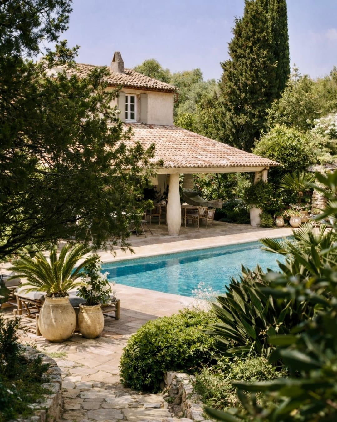With its 4 bedrooms, the main house and its stone mazet create a warm and inviting ensemble where every detail reflects the history of the place. The terraces open onto the garden, the pool and the olive trees, encouraging an outdoor lifestyle shaped by shared meals, afternoon naps in the shade and long summer evenings.